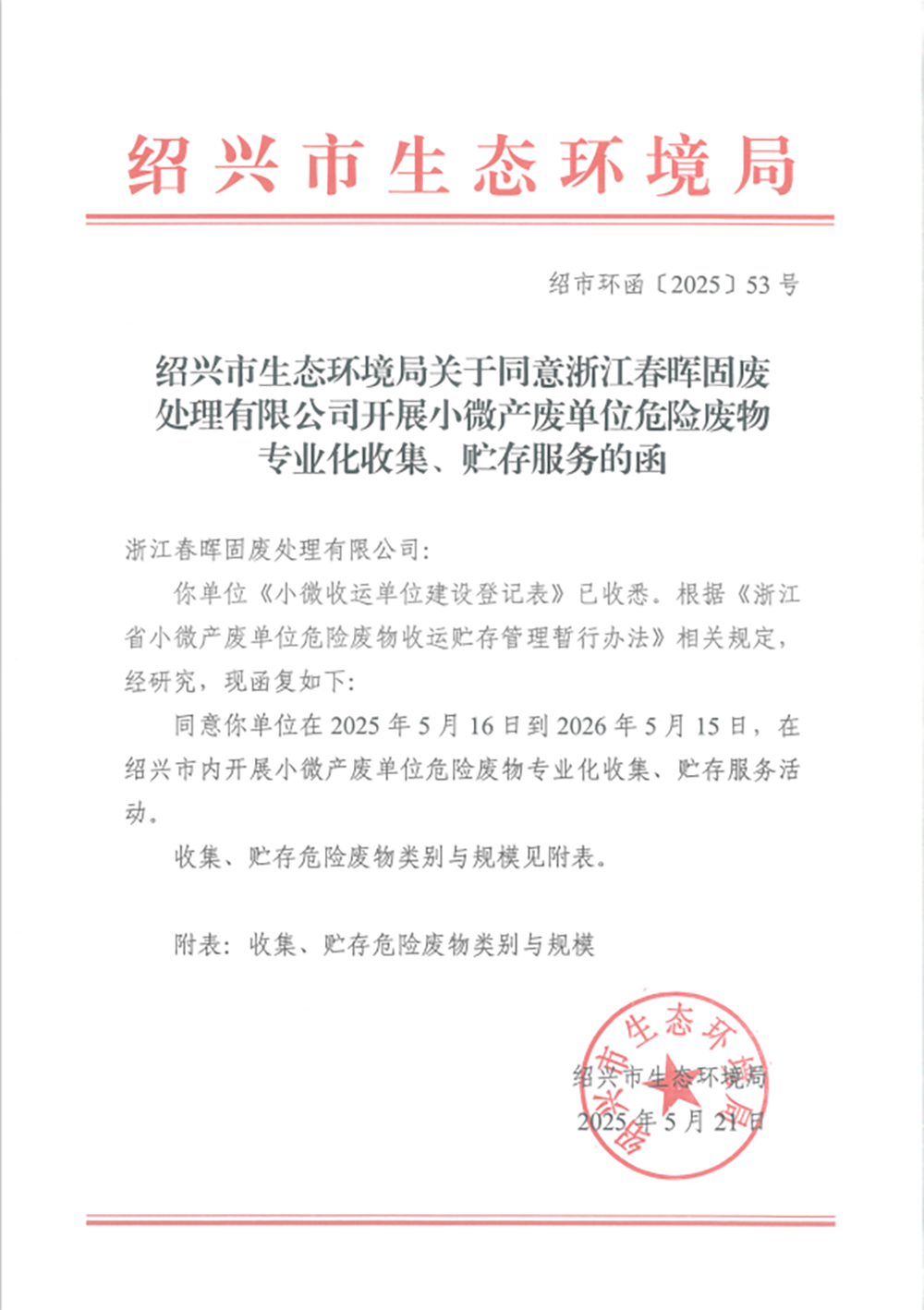 近日,春暉固廢經過紹興市生態環境局的審核批準,正式獲得了覆蓋紹興市全域的危險廢物小微收運資質,成為全市首家實現“全代碼”覆蓋小微收運服務的企業。這一舉措標志著紹興市危險廢物管理向精細化、專業化邁出了重要一步,同時也為小微企業危廢處置提供了更高效、合規的解決方案。