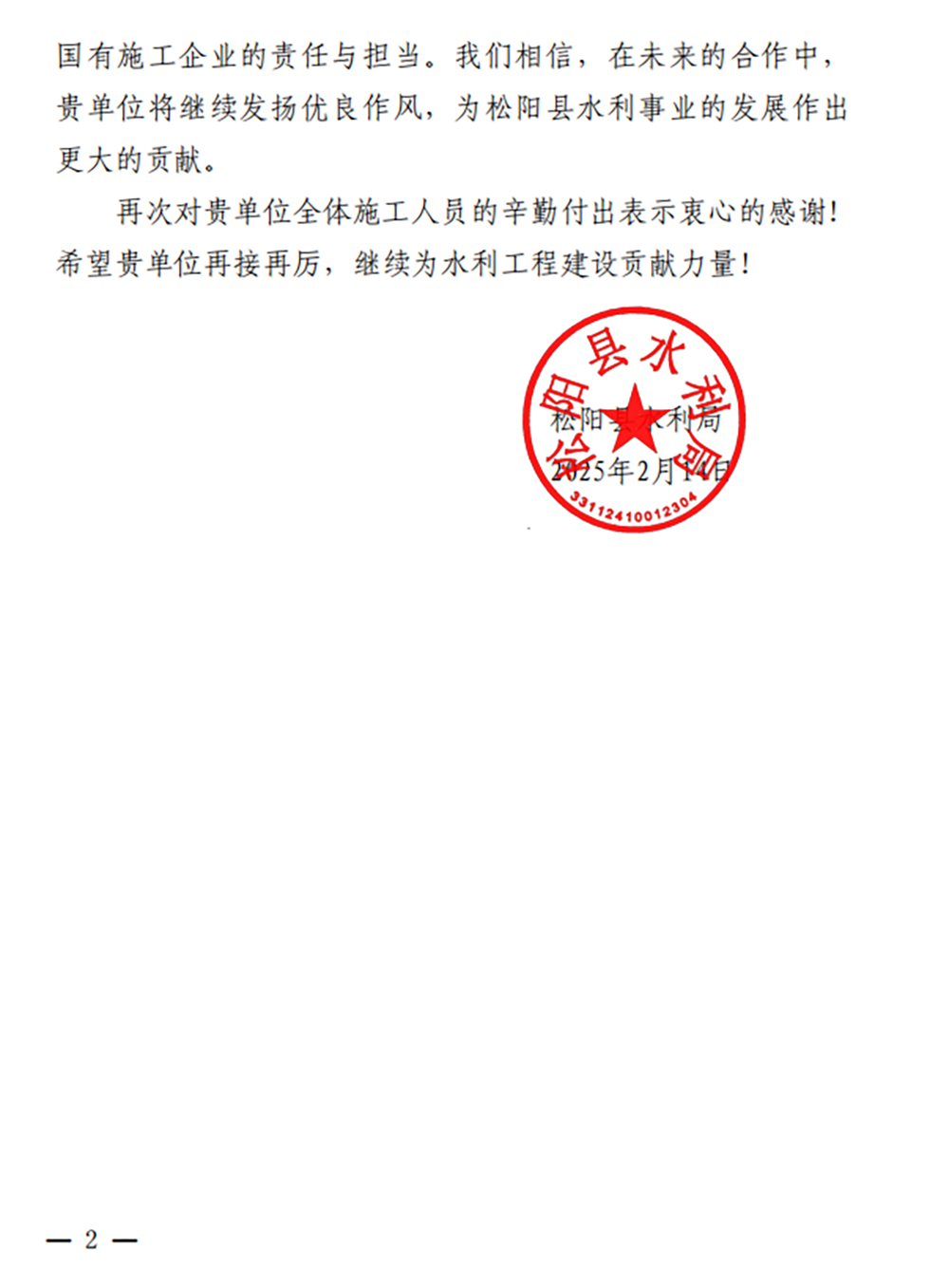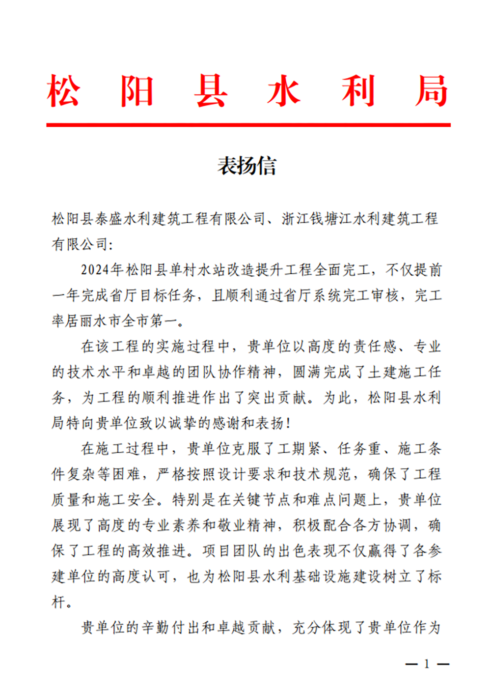 近日,一封來自松陽縣水利局的表揚信為“浙錢水建品牌”再添美譽。由浙錢水建承建的松陽縣單村水站改造提升工程得到了松陽縣水利局的高度贊揚和肯定。信中指出,浙錢水建施工項目團隊的出色表現不僅贏得了各參建單位的高度認可,也為松陽縣水利基礎設施建設樹立了標桿。